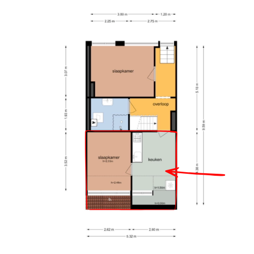 Kamer aan voorzijde op 2e verdieping met eigen keuken en gedeelde badkamer op de eerste verdieping.